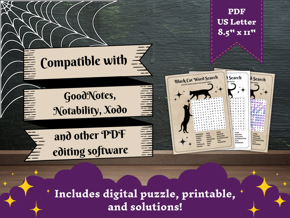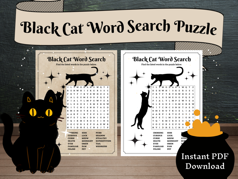 Black Cat Word Search Puzzle | Digital and Printable Word Search with Solution | Instant PDF Download